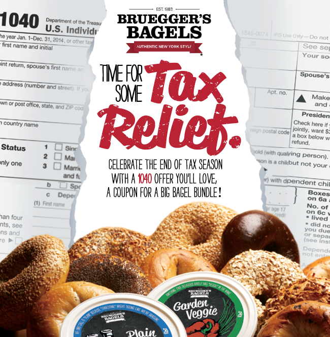 Tax Day break on its Big Bagel Bundles. April 11-15, Big Bagel Bundles are just $10.40 – about a $3.50 “deduction” – for guests who are members of Bruegger’s Bagels’ email club and those who sign up for the program by April 9. Guests who sign up for the eClub also will receive a free bagel with cream cheese and other valuable offers throughout the year.